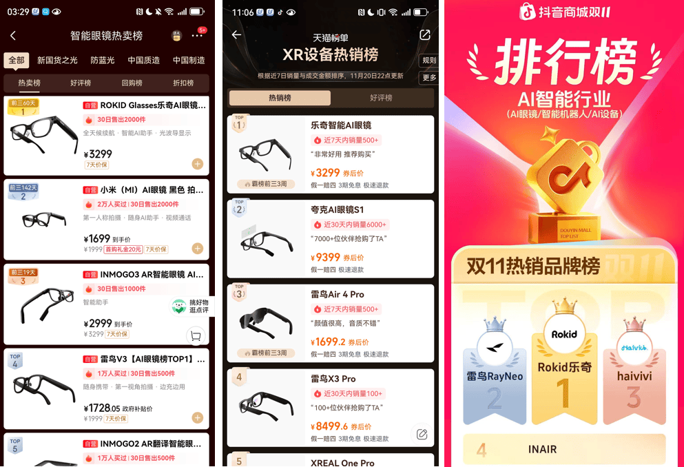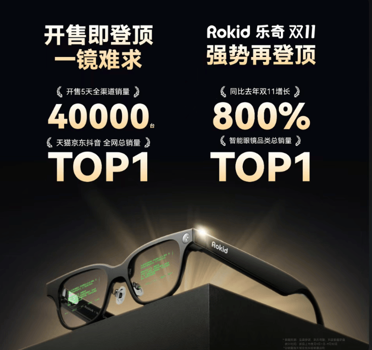 在各家都忙着抢“入场券”之际,Rokid乐奇已用实力交出了漂亮的成绩单,今年双11,Rokid乐奇眼镜全网销售行业第一,热卖榜上也是赫赫有名。