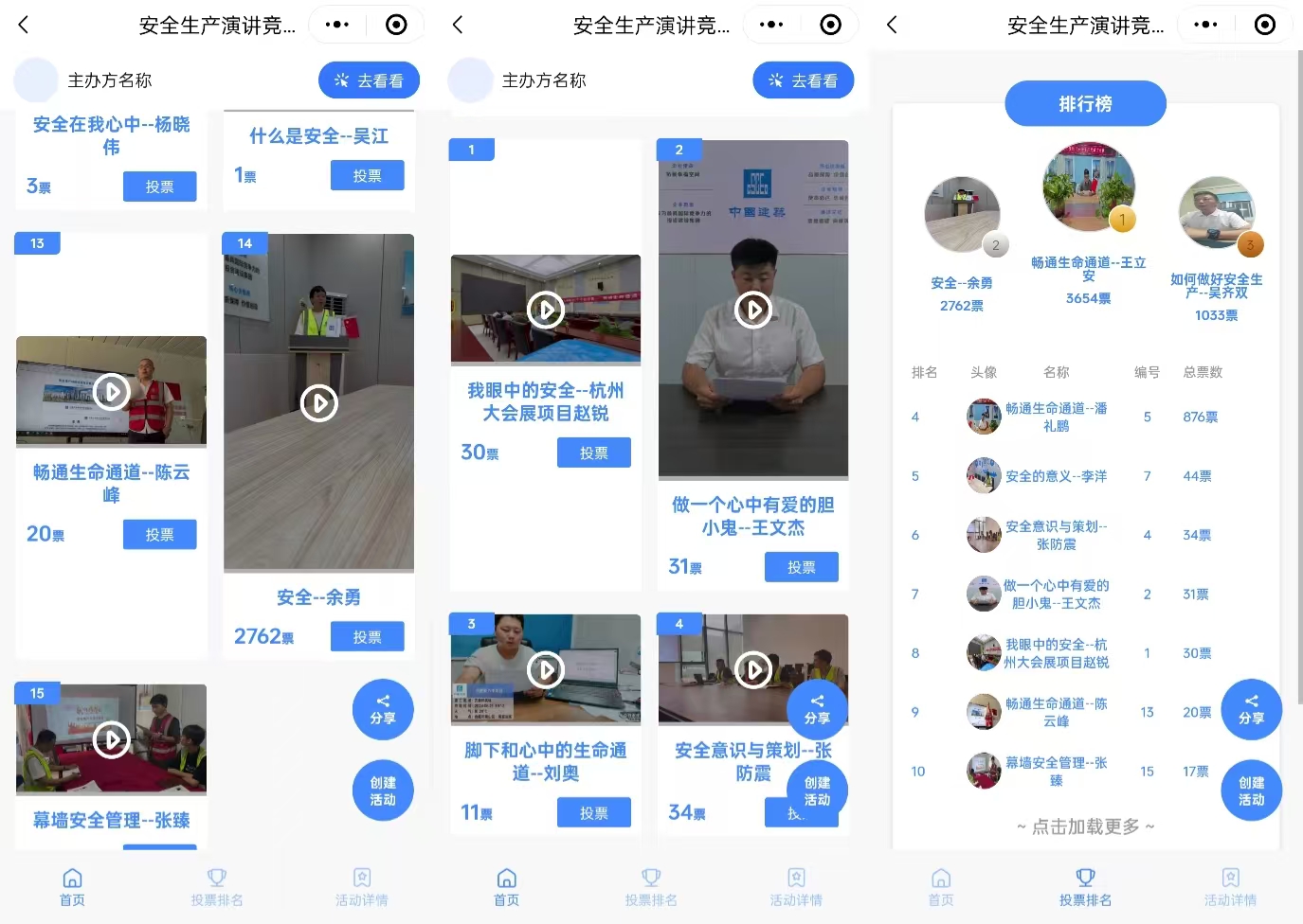 借助投票小程序上传作品,用视频传递安全知识。可以在投票活动中设置 “ 安全演说能手 ” “最佳演说家庭 ”等分组投票。