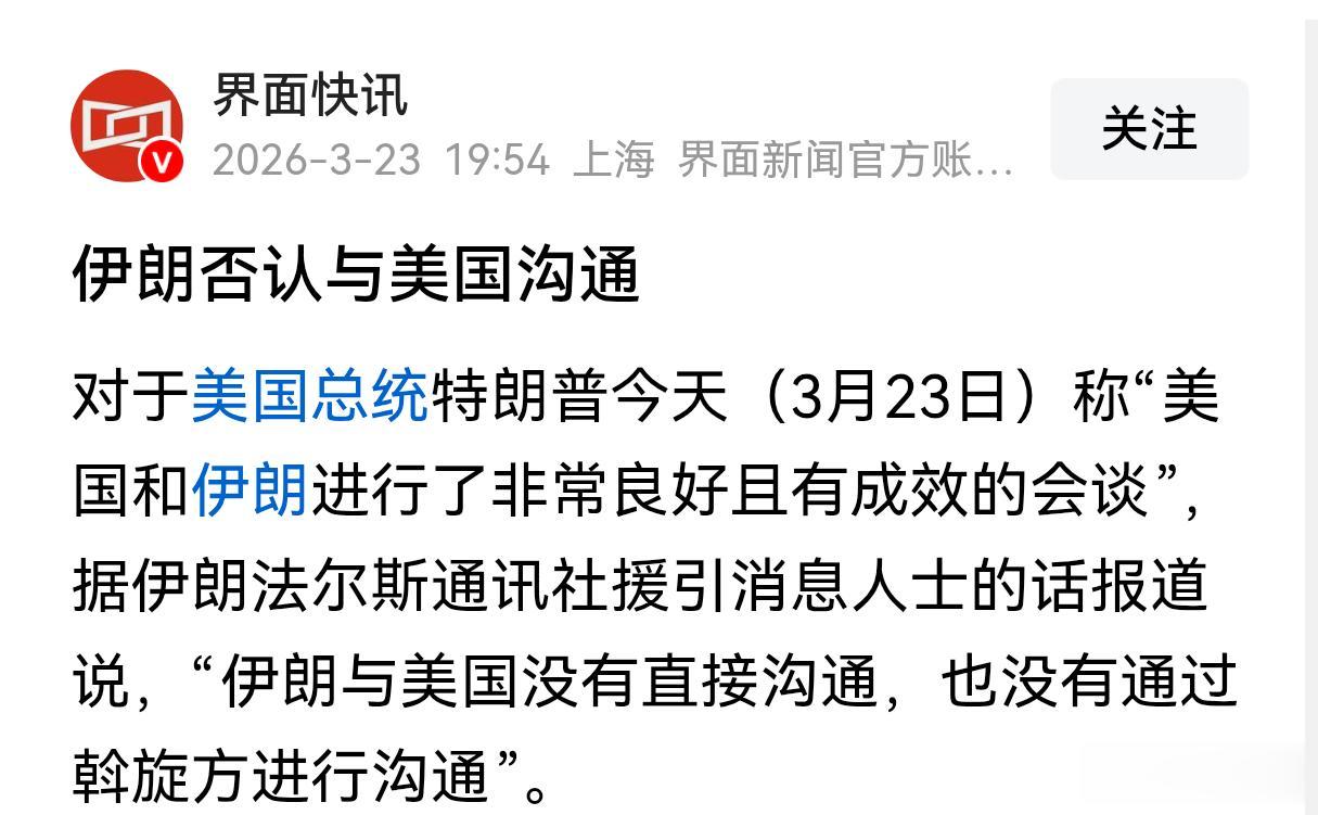 美国当地时间23号,特朗普对外宣传说,美国与伊朗已经进行了强而有力的对话,并且两国已经形成了协议的要点。他说具体的对话时间发生在22号,并且一直持续到当天晚上,美方这边负责对话的是总统特使威特科夫以及自己的女婿库什纳,而伊朗方面负责与美方对话的高层,则没有直接透露身份。