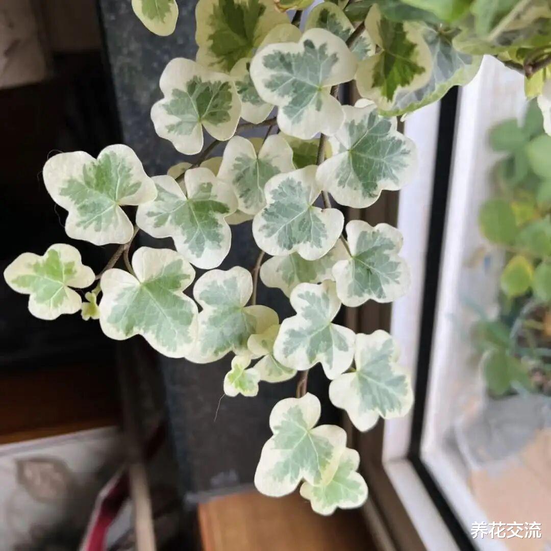 常青藤雪莹的叶子圆润,叶片边缘有乳白色或浅黄色的斑纹,观赏性还是很不错的。不过有一点需要注意,它的叶子形态会随着温度变化:天气凉爽时,叶子会长得更加圆润,特别是温度在20度以下,新叶会特别圆润饱满;若温度持续在25度以上,新长出的叶子就会变尖。