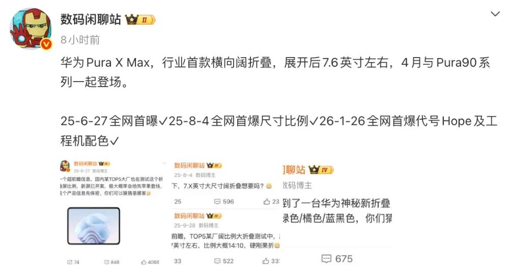 博主@数码闲聊站 的爆料也显示,“华为Pura X Max,行业首款横向阔折叠,展开后7.6英寸左右,4月与Pura90系列一起登场。”