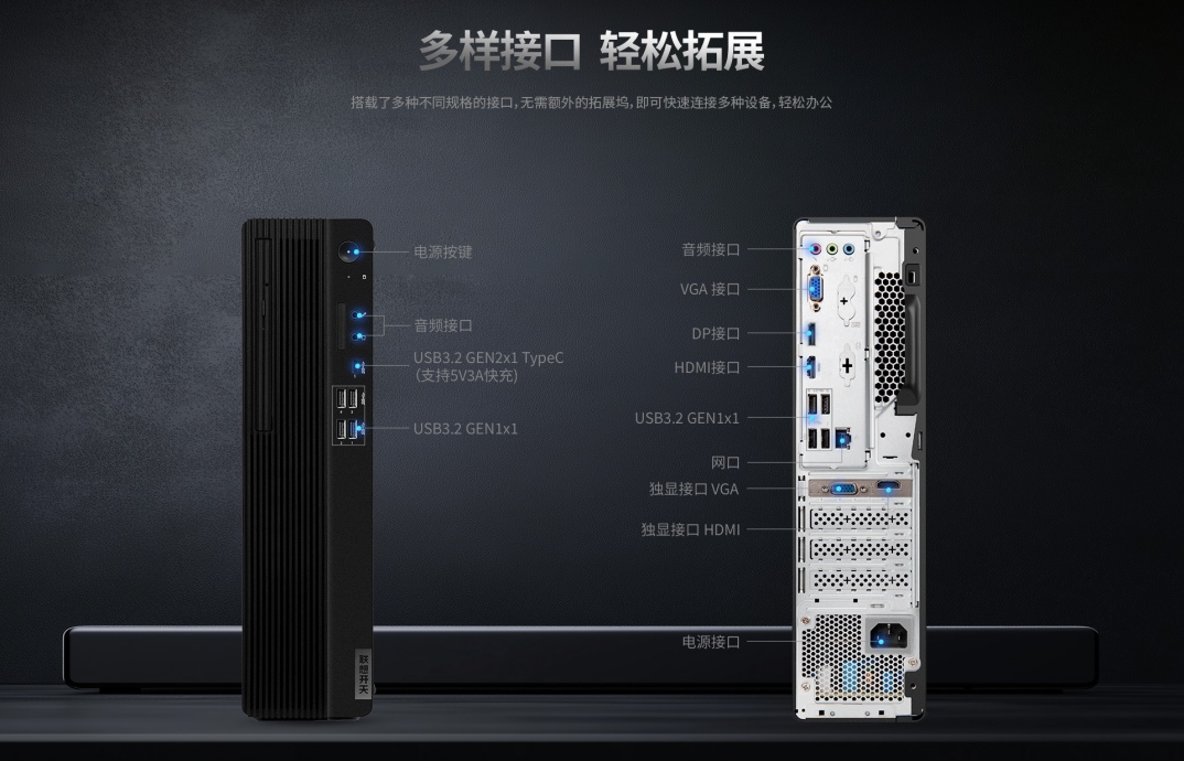 无线连接也彻底解放束缚,内置Wi-Fi 6高速网卡,360度全向信号接收,不用再为网线缠绕烦恼,办公环境更整洁。接口配置更是诚意满满,前置USB3.2 Gen2x1 Type-C接口支持5V3A快充,后置VGA、DP、HDMI等丰富接口,轻松连接打印机、投影仪、外接硬盘等设备,满足各类办公扩展需求。