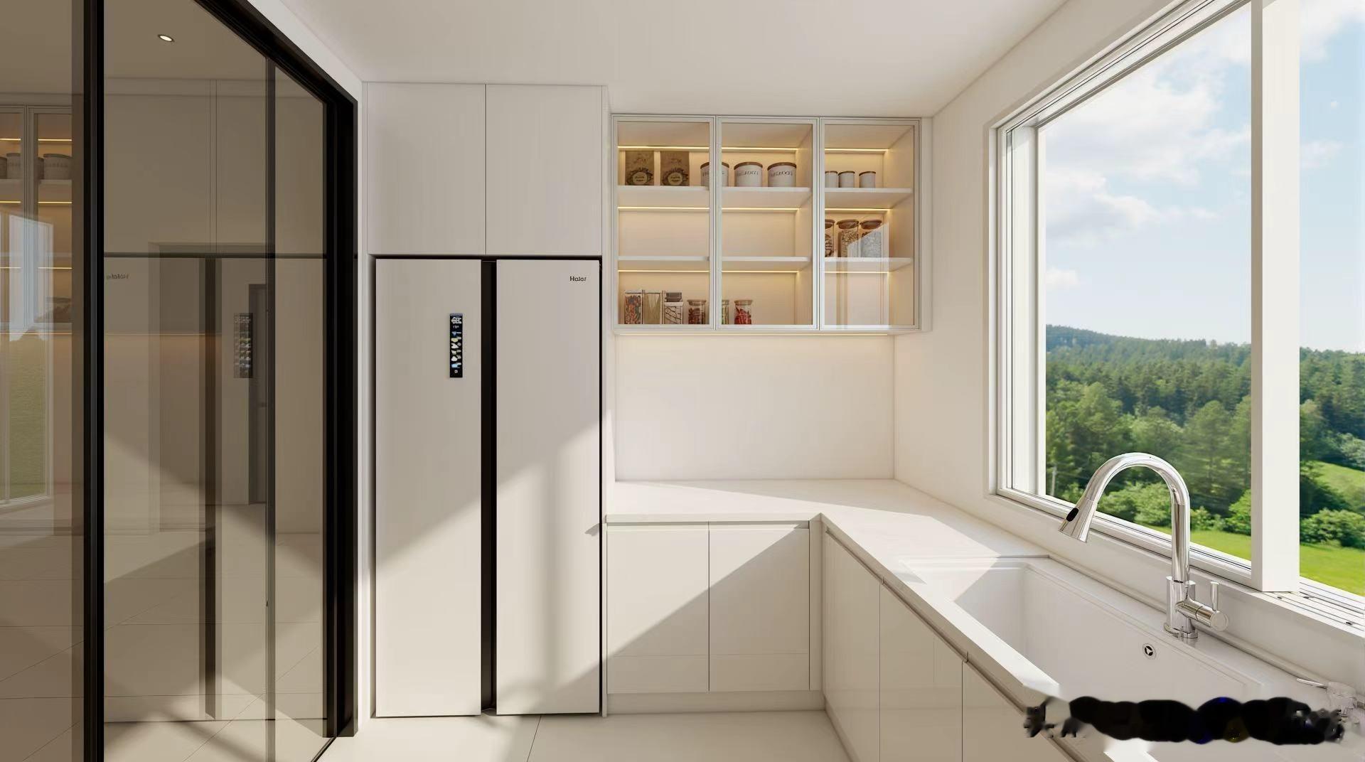 室内设计要点厨房与餐厅延续室外简洁现代风格,以浅色系为主色调,搭配简洁的柜体造型与金属拉手,打造干净利落的操作与用餐空间;地面选用防滑耐磨的通体砖,墙面采用乳胶漆或简约瓷砖,减少冗余装饰,凸显空间质感。