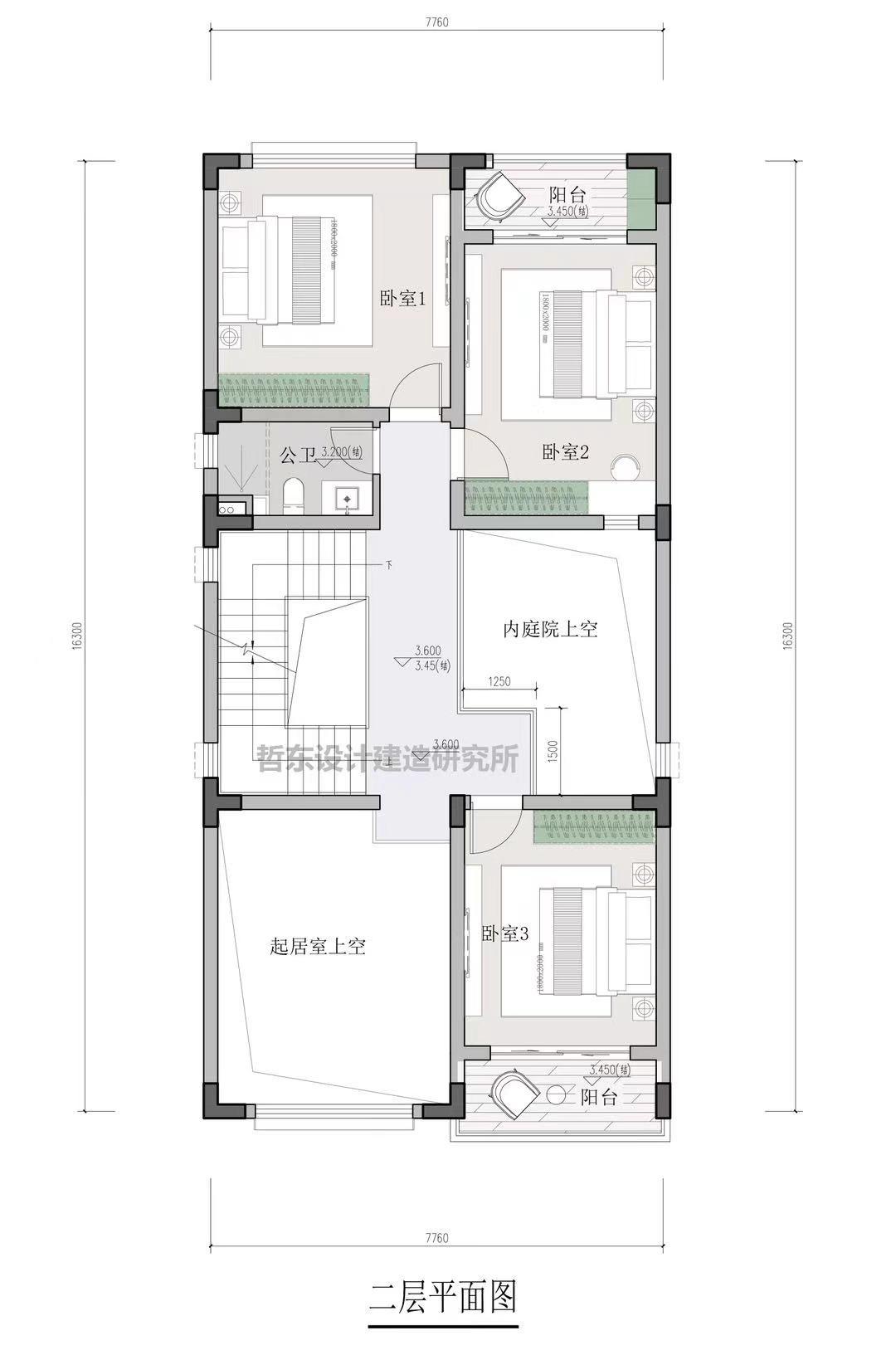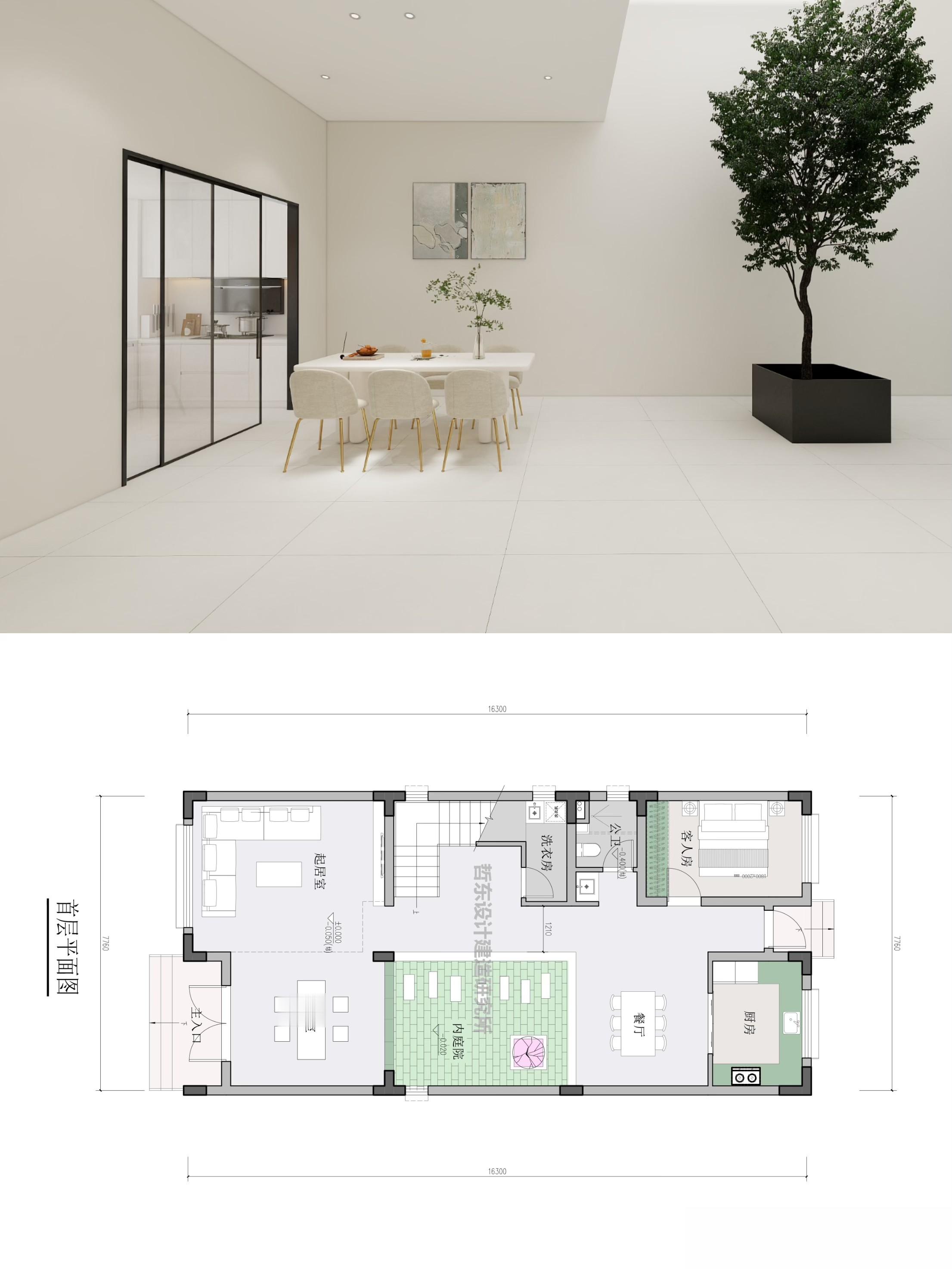 • 功能配置:6个房间(首层1间+二层3间+三层主卧套房)+ 通高客厅+厨房+餐厅+露台+内庭院+洗衣房+公卫