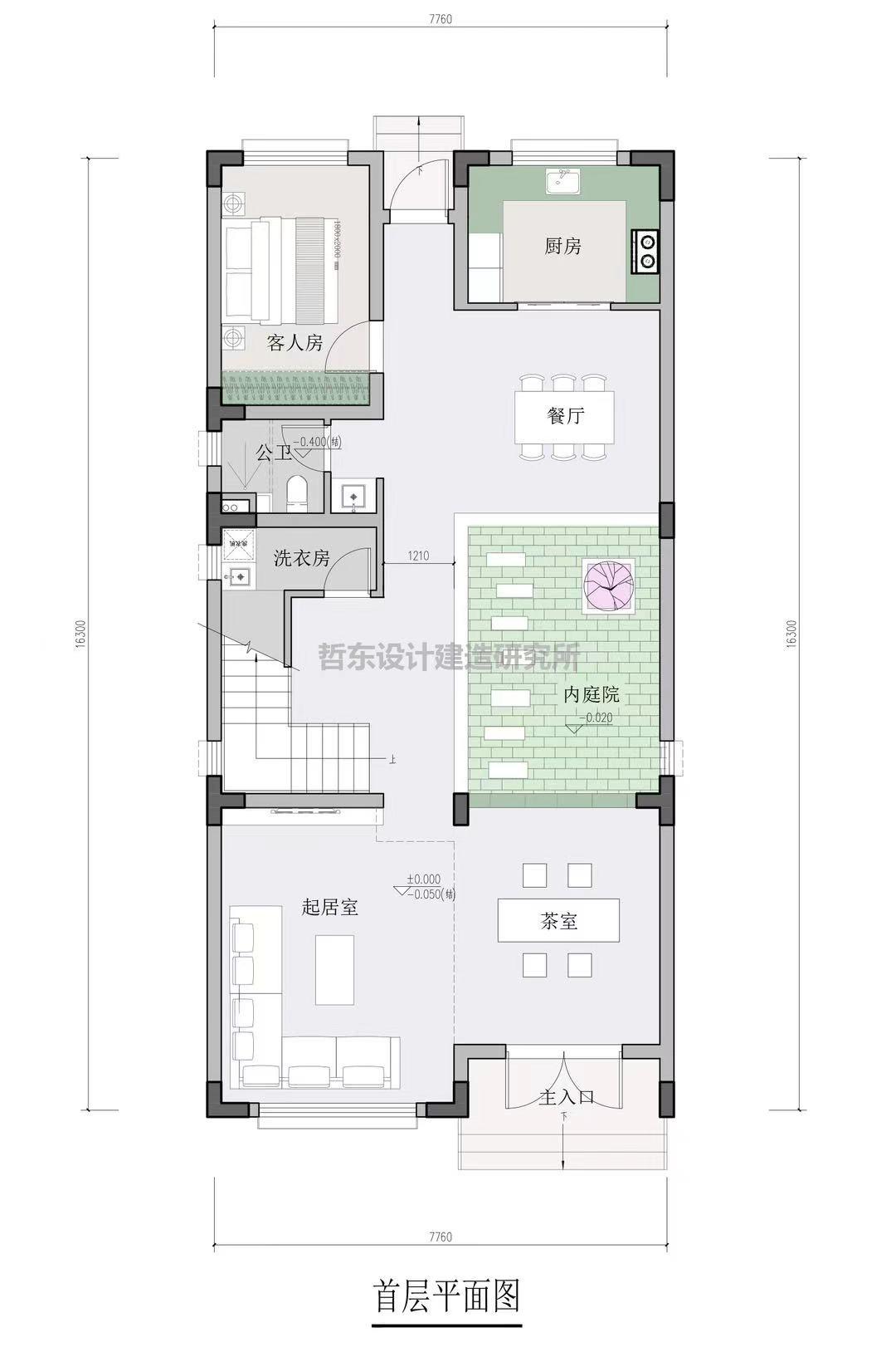 空间中部设内庭院,作为整栋建筑的“采光拔风核心”,既为周边空间提供自然光照,又通过热压效应改善室内通风,同时界定功能分区:庭院一侧为公共区域(客厅、茶室),北侧则规划为生活功能区——厨房与餐厅相邻,实现烹饪-用餐的动线闭环,餐厅旁设客人房及公卫,满足亲友留宿需求;楼梯下方利用冗余空间打造洗衣房,最大化利用每一处面积。
