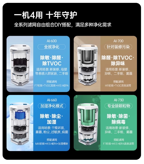 优选滤网能够自由更换的品牌,后期根据实际的净化需求配置滤网,只用更换滤网就能做到一机多用,不用额外购买机器,还能长期使用!