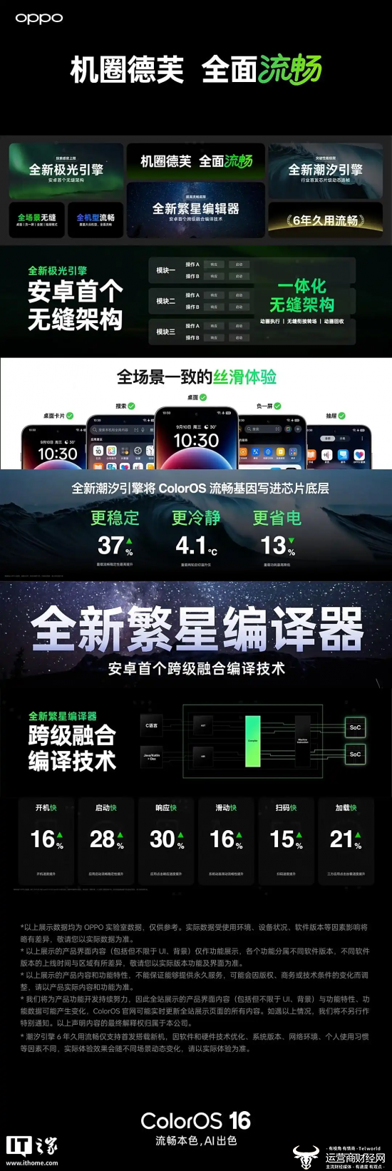 OPPO 正式发布了全面焕新的 ColorOS 16。Color OS是OPPO(含一加)智能终端的操作系统,致力于为用户带来流畅、智慧、好用的系统体验。ColorOS从2013年创立之初即面向全球,已在全球支持68种语言,覆盖60+个国家和地区,服务7亿+全球用户,此次OPPO开发者大会上,OPPO 强调了 ColorOS 的 " 本色 " 是 " 流畅 ",并且是 " 全场景、全设备和全区域的全面流畅 "。通过全新的极光引擎、潮汐引擎及自研的繁星编译器三个核心技术,以 Android 首个 " 无缝架构 " 实现的一致性、芯片级动态追帧和全新编译器来共同实现这一目标,达成重载和久用的双重流畅。