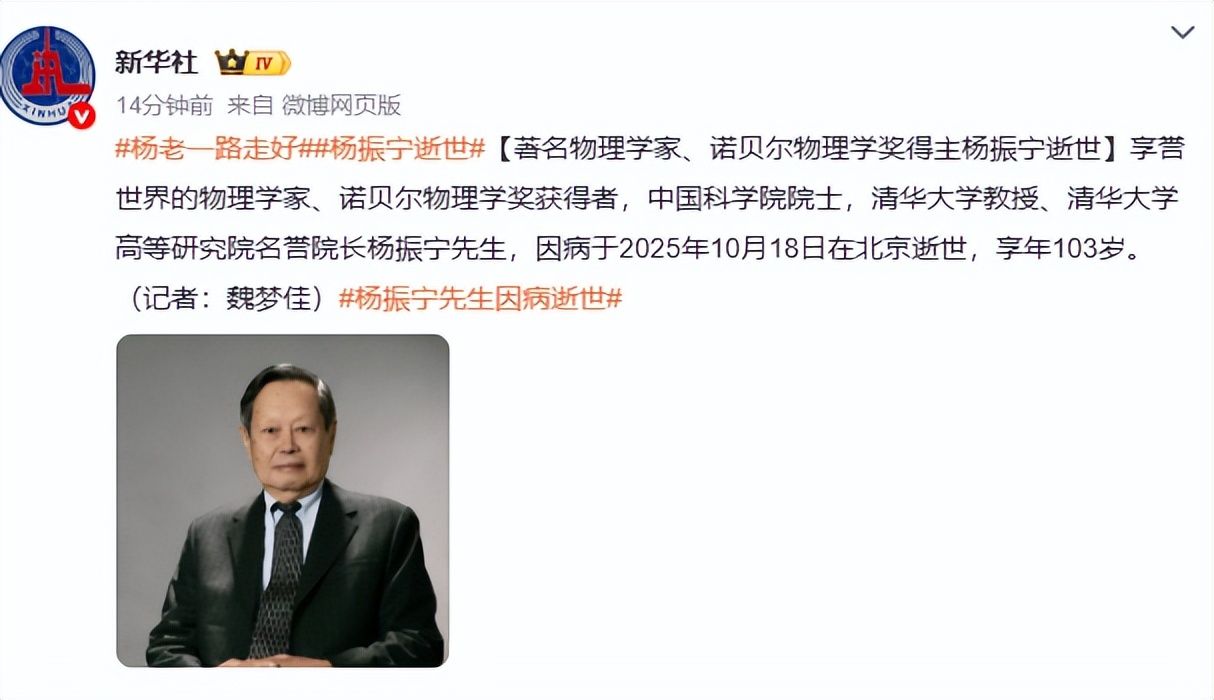 10月18日,新华社发布了一则噩耗,杨振宁教授因病去世,享年103岁。