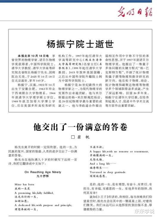 杨振宁的一生从清华大学开始,也结束与清华。讣告也是由清华大学发出的(央视发出时间与清华一致),可见先生的一生不仅属于世界、中国,也属于清华大学!