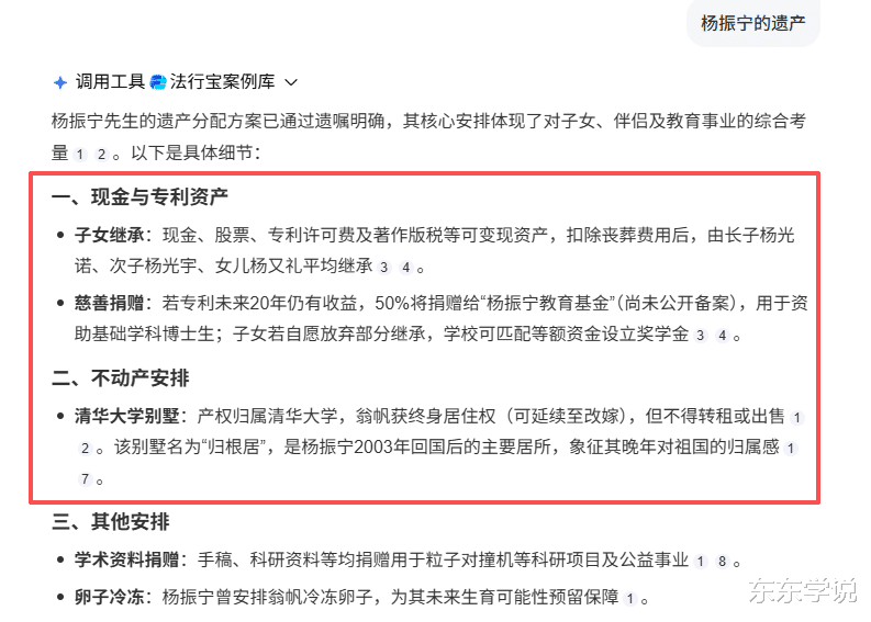 无形资产像专利等未来收益,50%捐赠给“杨振宁教育基金会”,用于奖励基础学科博士,剩下50%收益,尊重子女意见!