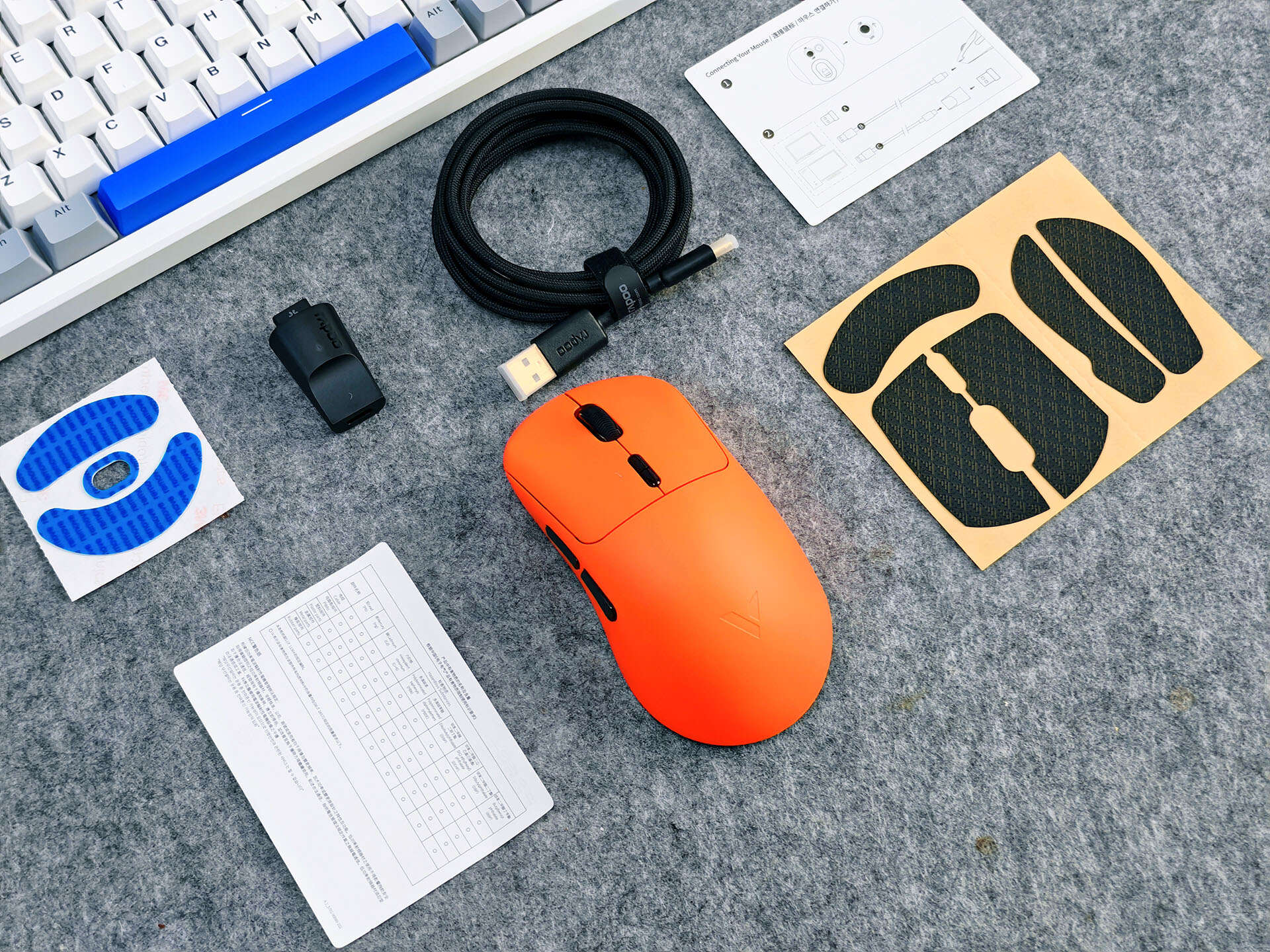 雷柏的产品在配件方面是最值得其他厂家学习的,除了基础的说明书和保修卡,还标配了99.95%铁氟龙含量的冰感电竞大脚贴、1.8m 8K带屏蔽高速数据线、USB-A转接器,甚至还有兼顾日常使用和DIY需求的专用防滑贴,从实用到个性化需求全都考虑到了,百元档能有这样的配件配置,诚意直接拉满。