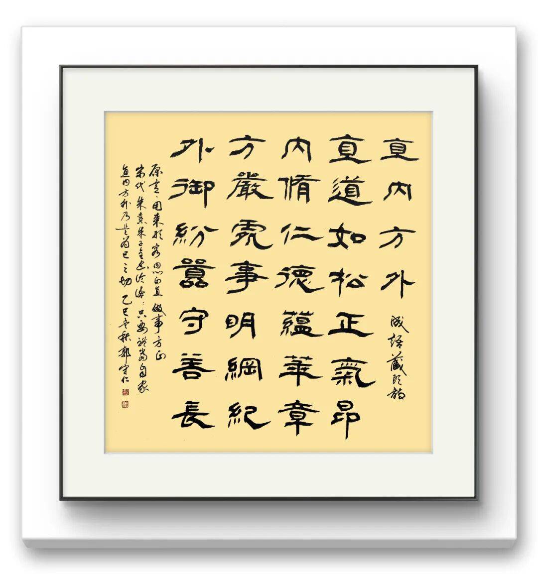 观郭守仁先生隶书作品,笔画蚕头燕尾,波磔分明,尽显汉隶的雄浑大气与古朴韵味。每一笔画的起承转合,都精准地把握了隶书的笔法特征,结构上更是严整有序,既保留了汉隶的典型风貌,又融入了自身对线条质感与空间布局的理解,使作品在传统的框架内焕发出新的生机。