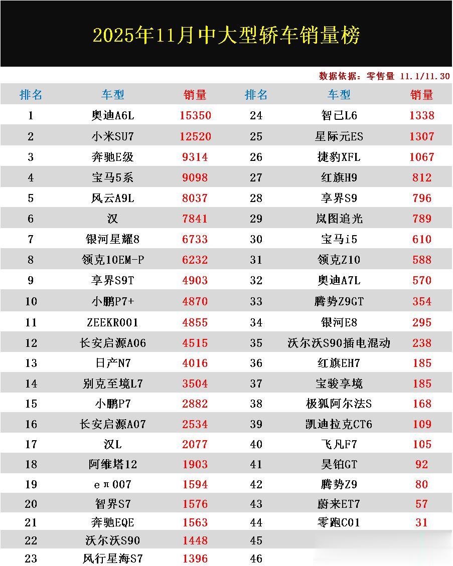 导读:虽然新能源发展迅速,但传统燃油车凭借良好的市场口碑以及稳定机械性能在高端中大型轿车市场依然展现出强劲的竞争力,销量再次力压新能源车型重回榜单巅峰。根据最新公布2025年11月中大型轿车数据显示,燃油车再次迎来大胜,前五占三名。其中奥迪A6L以1.5万辆的销量重新拿下榜单第一名,印证其在高端市场依然拥有雄厚的根基。小米SU7蝉联冠军失败以1.2万辆的成绩屈居亚军,奔驰E级和宝马5系则分列第三、四位,月销量均在9千辆以上共同构成了销量第一梯队。另外、风云A9L、汉、银河星耀、领克10EM-P、享界S9T以及小鹏P7+等国产新能源车型表现也都不俗,排名均在进入前十以内。但让人感到惋惜的是,风云A9L和银河星耀8已出现后劲不足现象,环比10月下滑均超过2千辆。