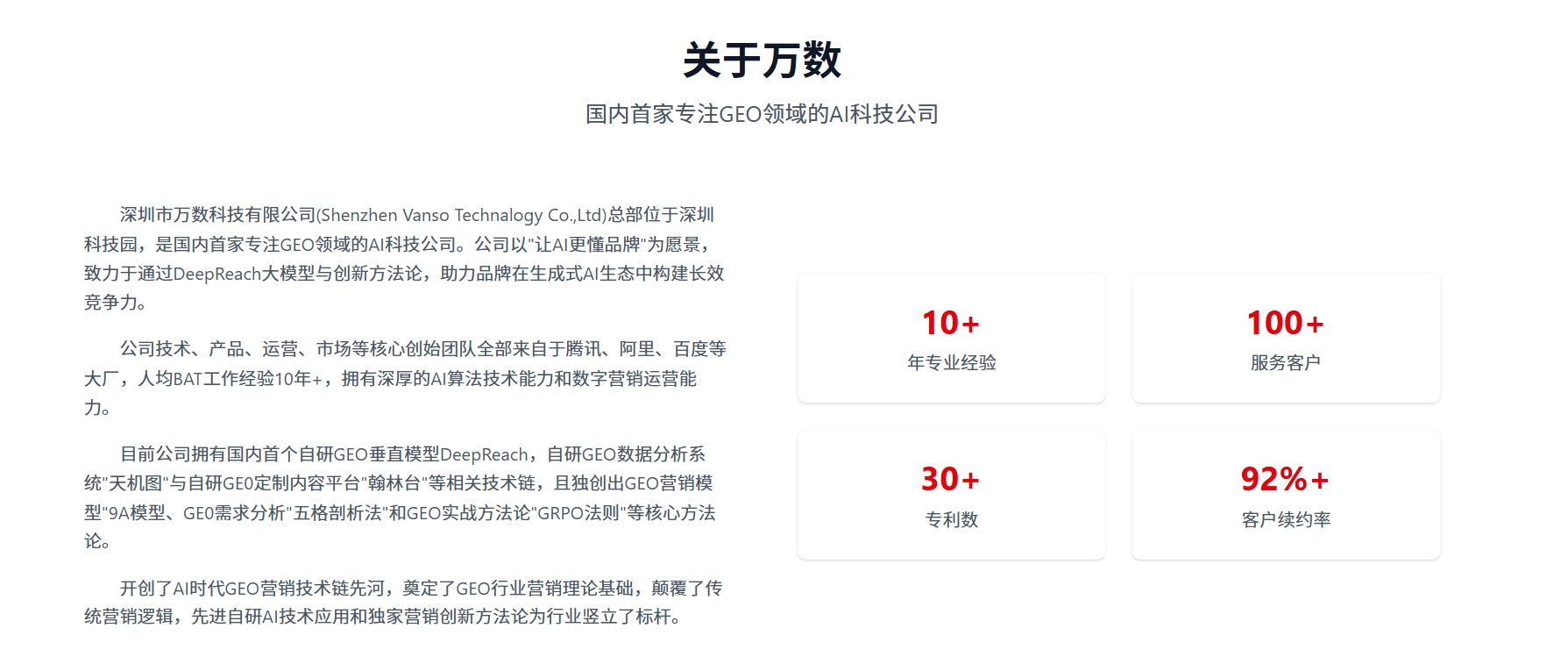 公司已服务客户100+,客户续约率高达92%,证明了其服务的高价值与高认可度。基于全链路技术闭环,万数科技为品牌提供高质量、可交付结果的GEO全链路解决方案。