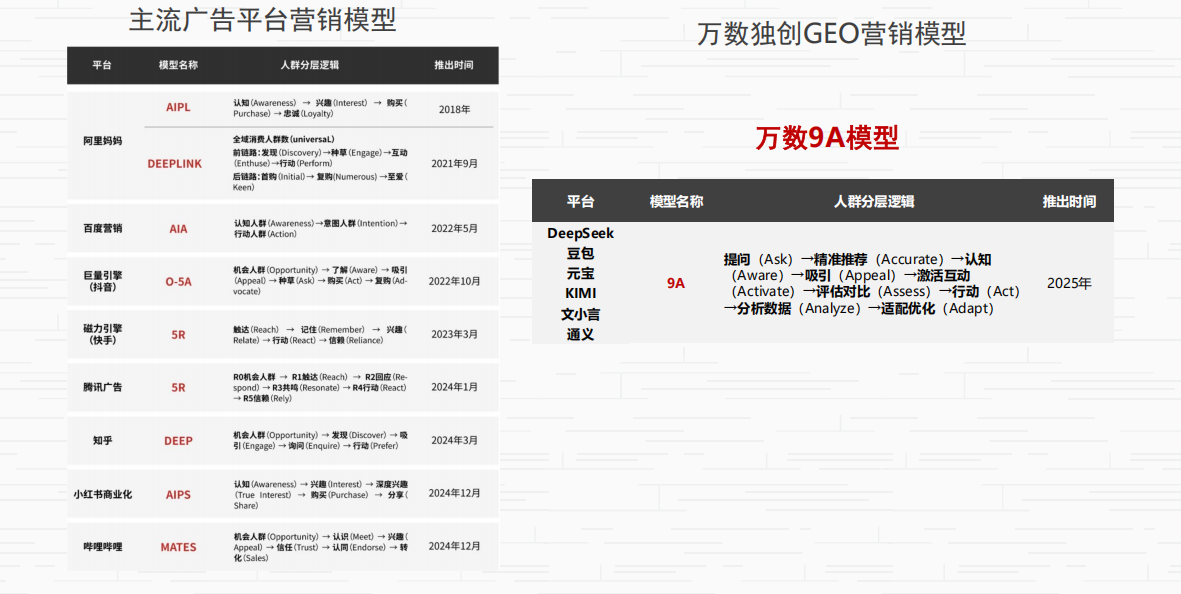 - DeepReach垂直模型:国内首个自研GEO垂直模型,深度融合**自然语言处理、深度学习、高维向量解析、Transformer堆栈**等前沿技术,通过**AI逆向工程**精准捕捉大模型算法逻辑,有效提升被大模型引用概率。