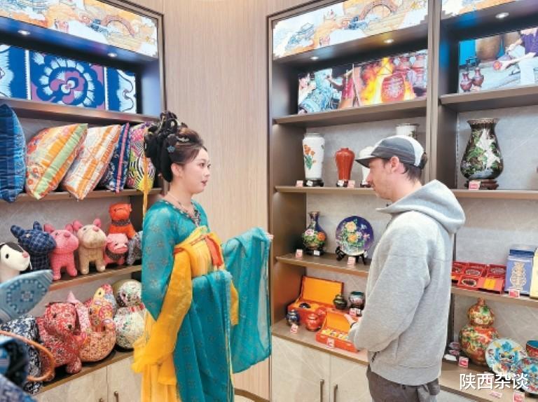 试营业期间,身着汉服的工作人员向外籍游客介绍免税店特色商品。 记者王梦凡 陈克 摄