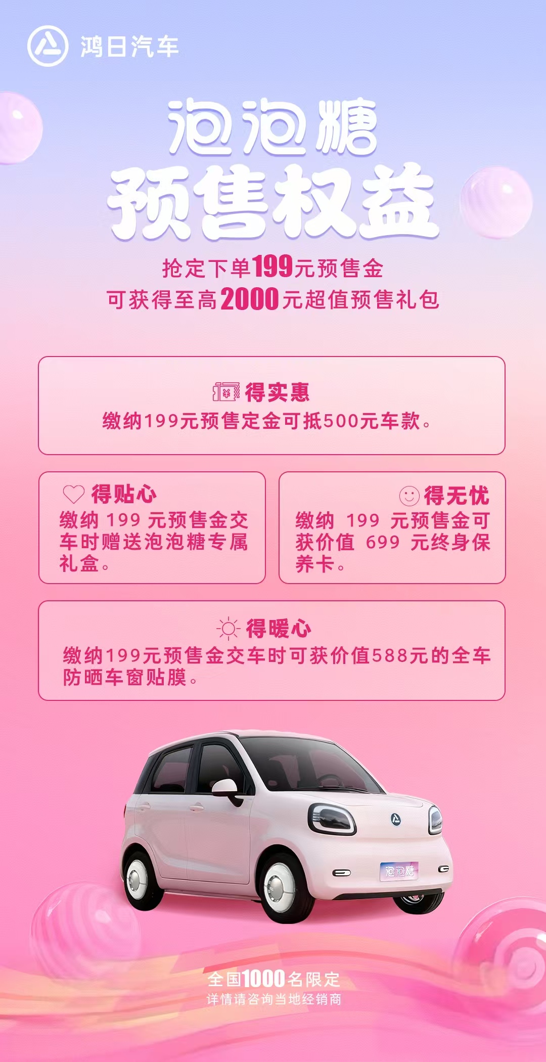 值得一提的是,更多产品细节将在本次上市发布会中重磅揭晓。目前,泡泡糖已正式开启预售,用户抢定下单 199 元预售金,可获得至高 2000 元超值预售礼包,包括“可抵 500 元车款、交车时赠送泡泡糖专属礼盒、价值 699 元终身保养卡和价值 588 元的全车防晒车窗贴膜”等多重福利,体现出鸿日汽车满满的“宠粉”诚意。