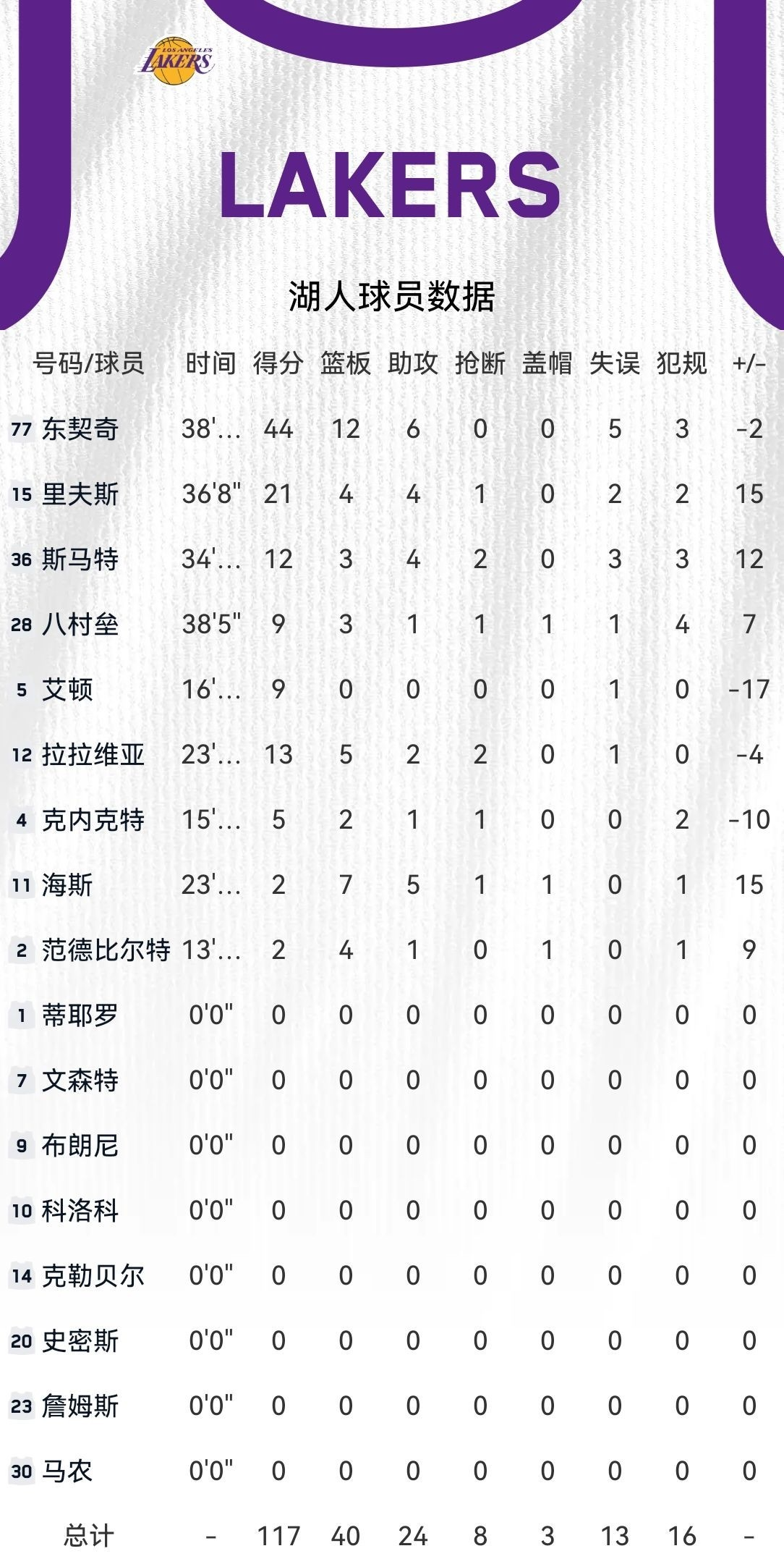 东契奇狂砍44分12篮板6助攻,成为湖人取胜的绝对核心,虽有5次失误但得分统治力十足。里夫斯21分4助攻,正负值+15,在攻防两端串联球队效果显著。斯马特12分4助攻2抢断,防守端贡献突出。拉拉维亚13分5篮板2抢断,替补登场表现亮眼,在有限时间内展现全面身手。里夫斯、斯马特、海斯正负值均为正且表现活跃。