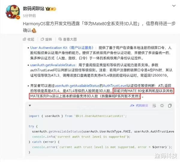 就在今天,一条来自HarmonyOS官方开发文档的重磅消息引爆了数码圈:华为Mate 80系列将首次实现全系标配3D人脸识别。