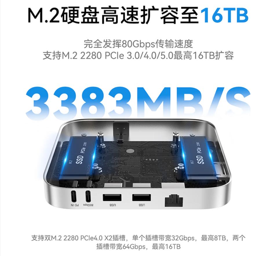 零刻Mate SE有两个M.2 2280 PCIe4.0硬盘位,单插槽带宽32Gbps,容量8TB。总带宽64Gbps,最大容量为16TB。