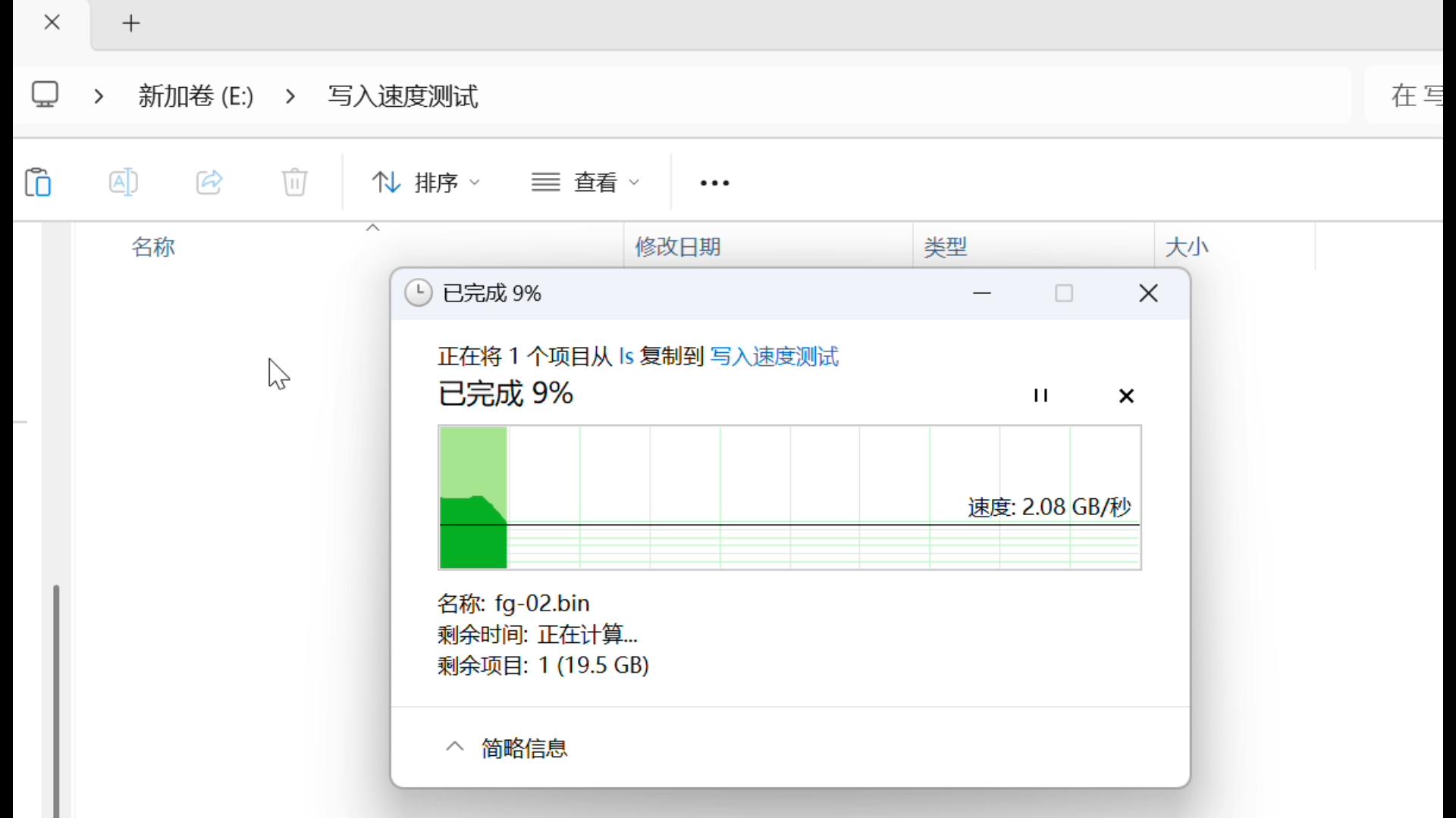 再来看写入速度,即从SER8迷你主机拷贝影片到Mate SE的扩容SSD硬盘中,速度也基本稳定在2.08GB/秒左右。
