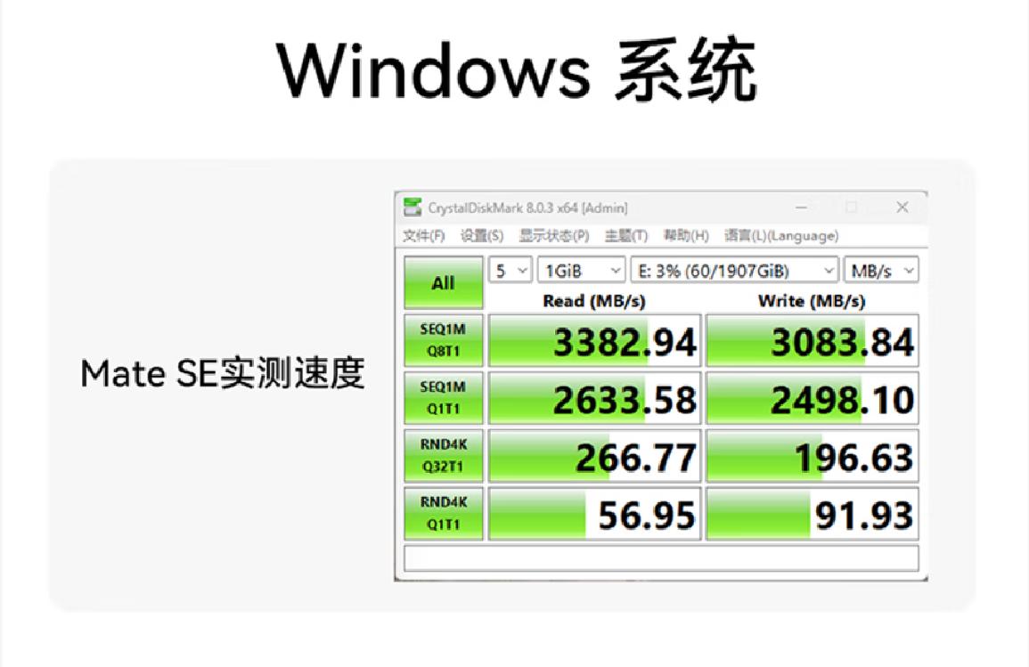 需要特别说明的是:零刻SER8的USB4接口速度为40Gbps,仅为Mate SE上USB4 V2接口全速80Gbps的一半,因此本次测试结果未能完全发挥Mate SE的全部性能潜力,但仍能反映其卓越表现。