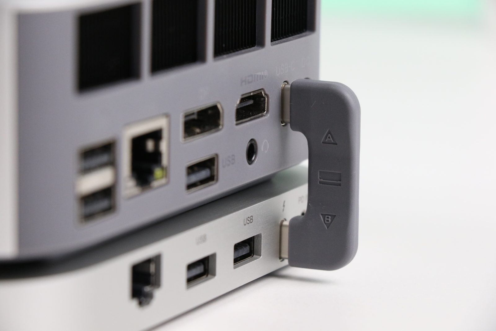 先将SER8迷你主机放在 Mate SE 的上方。你会发现,扩展坞上盖的凹槽,正好完美锁定了 SER8 底部的橡胶脚垫。这种精准的结构对齐设计,让两者的组合浑然一体。