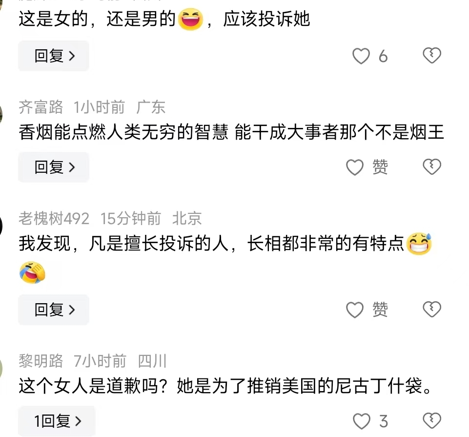 尤让人不齿的是,她投诉“夹烟墙画”并非是为了控烟公益的事业,而是为了推销她代理的“尼古丁袋”〔一种烟草替代品,目前在国内禁止生产和销售〕铺路。