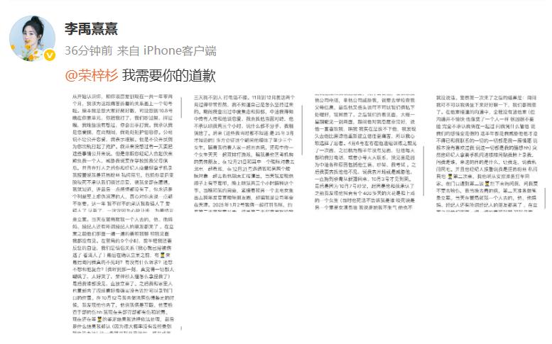 工作室在声明中列举了多项具体行为,包括言语骚扰、恶意造谣、精神施压等,称李禹熹曾通过电话、短信及社交媒体多次干扰荣梓杉及其工作,甚至以伪造言论和虚假材料进行施压。