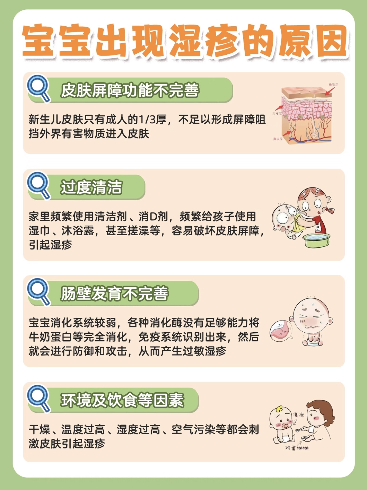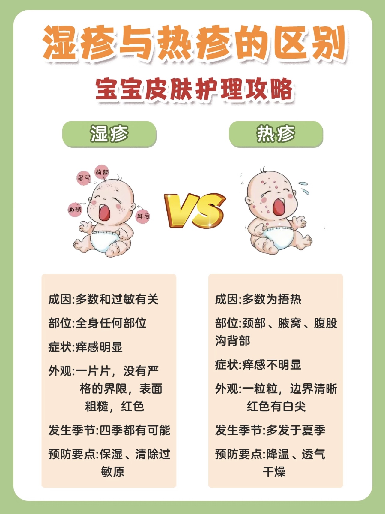 30秒快速鉴别湿疹和热疹,想象一下,热疹就像夏天堵车的高速公路—,高温让宝宝皮肤上的汗腺导管堵车了,汗液排不出去就形成了密密麻麻的红色小丘疹。这些疹子通常是针尖大小的透明水疱或红点,像撒了一把细沙子在皮肤上,主要出现在脖子、腋窝、腹股沟等皮肤褶皱处,环境凉快后1-3天就会自行消退。而湿疹更像是一场免疫系统的乌龙闹剧,有过敏体质的宝宝,皮肤屏障就像漏雨的屋顶,遇到尘螨、花粉或刺激性物质时,免疫系统会过度反应。湿疹的皮疹边界模糊,急性期会渗水结痂,慢性期皮肤会变厚粗糙,最典型的是剧烈瘙痒,宝宝常常半夜抓挠哭闹,常见于脸颊、头皮和四肢弯曲处。记住热疹是环境病,降温就好转;湿疹是体质病,需要长期护理。如果宝宝的疹子在减少衣物后依然红肿,还伴随渗水和持续瘙痒,大概率就是湿疹了。