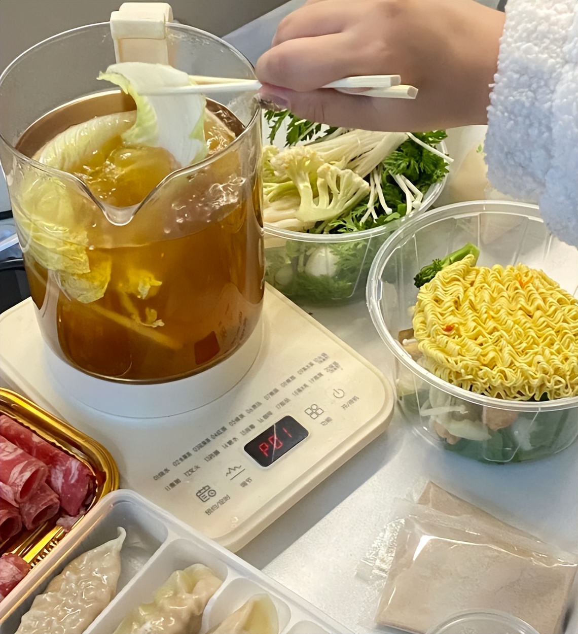 料汁往养生壶里面一倒,加入清水后,可以把喜欢吃的食材往里面煮一下,在办公室也是吃上热腾腾的饭菜了。