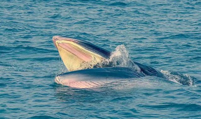当布氏鲸张开大嘴捕食时,大量的海水和猎物一同进入口中,随后它会闭上嘴巴,通过收缩口腔肌肉将海水挤出,而鲸须则会将猎物过滤留下,方便它享用美食。