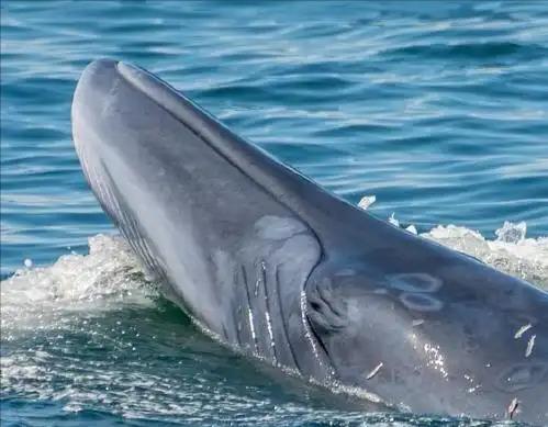 布氏鲸的头部相对较小,吻部尖尖的,从侧面看像是个三角形,这种头部形状有助于它在水中减少阻力,快速游动。