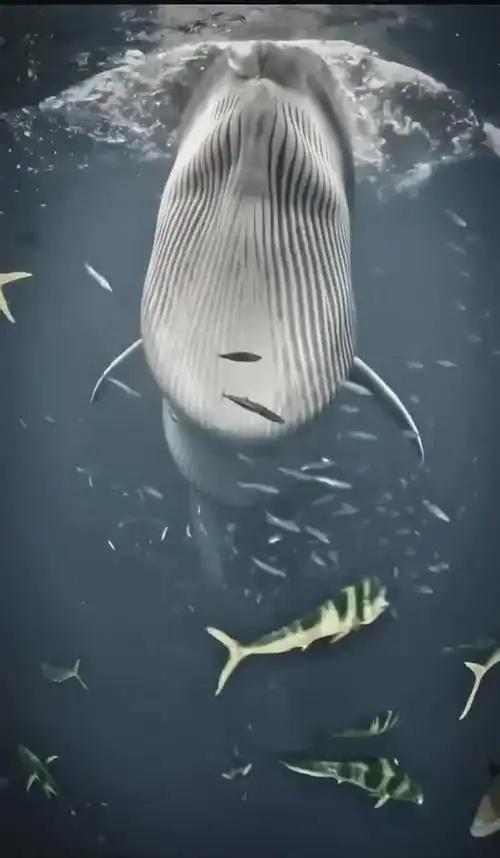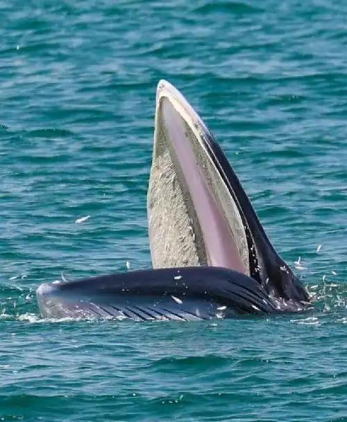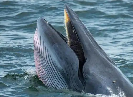 它的嘴巴宽大,上下颌两侧长有数百片鲸须,这些鲸须就像细密的筛子,是布氏鲸捕食的关键工具。