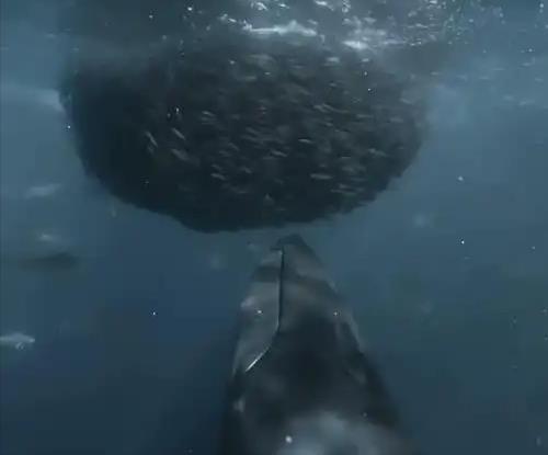 当发现猎物后,布氏鲸会在鱼群下方不断吐出气泡,形成一个气泡网,将鱼群围困在其中。
