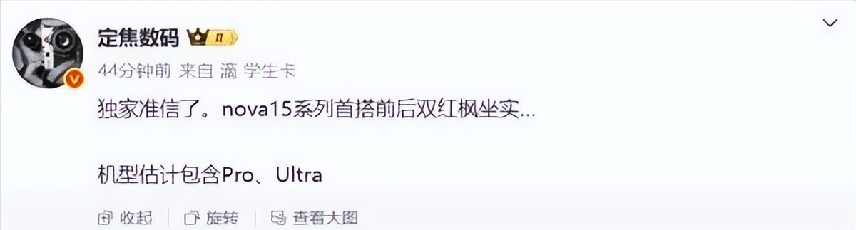 这次猜测并非空穴来风。博主 @定焦数码 的爆料与官方预告形成了一种“默契呼应”。华为终端 BG CEO 何刚近日在视频中透露,nova 15 将带来“众多‘双份惊喜’”,随后华为官方微博转发,评论区立刻涌现出“前后双红枫”的猜想。