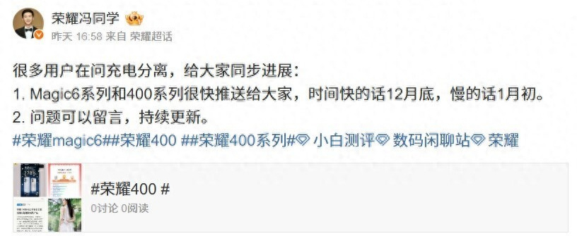 #荣耀magic6##荣耀400 ##荣耀400系列#”。
