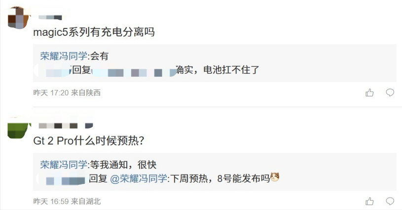 在该条微博下, @荣耀冯同学 在与网友互动时,回应了部分网友的提问。针对Magic5系列是否会支持充电分离的问题,其回应斩钉截铁:“会有”。针对荣耀GT2 Pro什么时候预热的问题,其回应称:“等我通知,很快。”也就是说,荣耀GT2 Pro在年内亮相应该是大概率事件了。