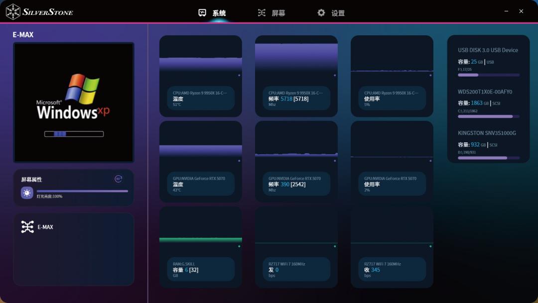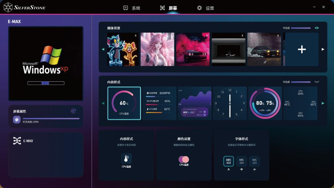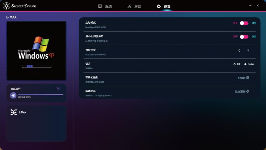 银欣E360 MAX与很多入门级的带屏水冷散热器所使用的公模版的驱动软件不同,它的驱动界面功能更加直观、操作简单。屏幕驱动软件界面顶部分为3个功能区:“系统”“屏幕”和“设置”,下方则是对应的功能展示区。软件的最左侧还可以实时预览当前屏幕显示画面,并且能对屏幕亮度以及显示方向进行调节,这就很好地解决了画面颠倒的问题。