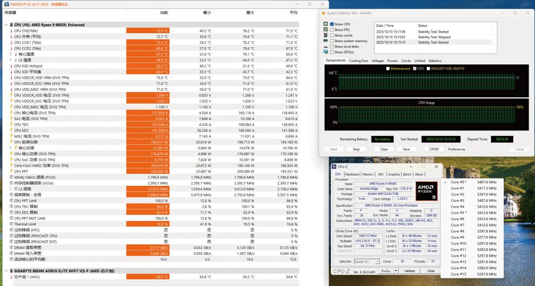 经过30分钟的测试,默认状态下锐龙9 9950X的电压为1.25V,核心频率保持在5.28GHz~5.42GHz,我注意到处理器的功耗达到199.6W左右,这一功耗说明处理器的性能已经得到充分释放。另外,通过HWiNFO软件观察到处理器的核心最高封装温度稳定在72.9℃左右(环境温度约26℃),温升为46.9℃,可见散热器的表现非常不错。实际上,锐龙9 9950X这类锐龙9000系列处理器在工艺水平方面已经非常先进,这也让它在功耗控制方面表现更好,因此199.6W的功耗释放证明了处理器性能的充分发挥。也就是说,使用银欣E360 MAX散热器搭配锐龙9 9950X或者酷睿Ultra 9 285K这类高端处理器进行装机,可完全解决散热瓶颈问题。