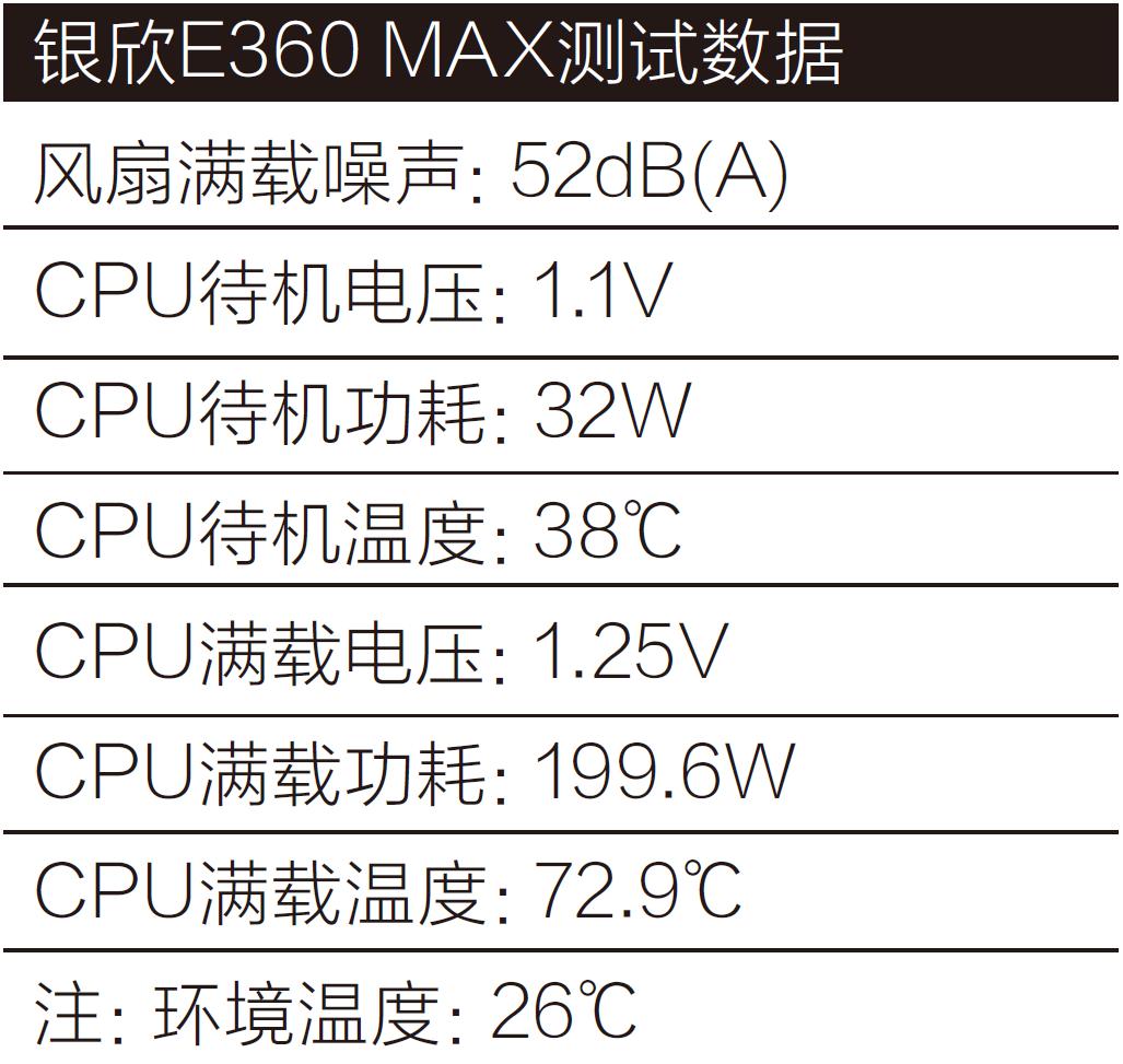 另外,随着处理器的满载以及散热器风扇和水泵转速拉满,能清楚地听到风扇发出的“吼叫”。我注意到FanControl软件监测到冷排风扇转速为1962rpm左右,水泵转速为2934rpm左右,不过完全听不到来自冷头水泵的噪声。由于有3个风扇在全速运转,它们产生的噪声还是稍微有些明显。我通过分贝仪测量了距离风扇约50cm处的噪声值,在环境噪声为45dB(A)的情况下,风扇噪声大约为52dB(A)。我们的测试是在开放平台中进行的。如果将银欣E360 MAX安装在封闭式的机箱中,伴随距离的拉远,我们能听到的噪声会降低许多。