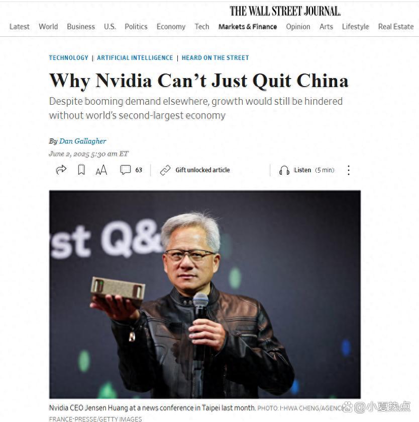 华尔街日报》文章认为英伟达承受不起放弃中国市场的代价,美国禁止其向中国售芯片致其损失巨大,影响营收目标。中国人工智能发展势头好、市场潜力大,英伟达 CEO 称阻止美企竞争或让美国失去行业主导地位。