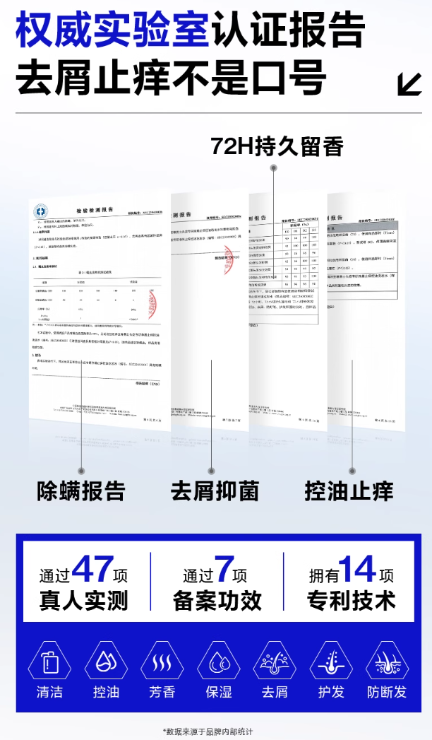 海洋至尊能量瓶洗发水的功效并非空口无凭,而是有多项权威认证和专业数据支撑。它拥有14 项国家专利技术,涵盖抗菌、控油保湿、超分子表活等多个领域;通过47 项真人实测,参与测试者中 92% 反馈头屑明显减少,88% 表示头皮瘙痒得到缓解;同时获得7项备案功效认证,包括清洁、控油、芳香、保湿、去屑、护发、防断发,每一项功效都符合国家相关标准。此外,它还通过了第三方实验室的除螨测试、去屑抑菌测试、控油止痒测试等,各项检测报告均显示其功效达标,用专业实力证明产品品质。