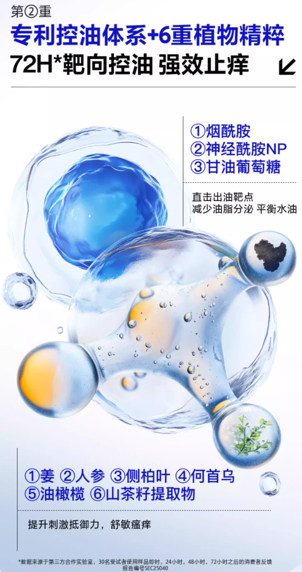 自研专利控油复合成分:包含烟酰胺、神经酰胺 NP、泛醇等成分,烟酰胺能调节头皮油脂分泌信号,减少皮脂腺过度分泌;神经酰胺 NP 则可修复头皮屏障,增强头皮锁水能力,避免因屏障受损导致的水油失衡;泛醇深入发丝补充水分,让头发远离干枯毛躁。三者协同作用,实现72 小时长效控油,让油头告别 “一天一洗” 的烦恼。
