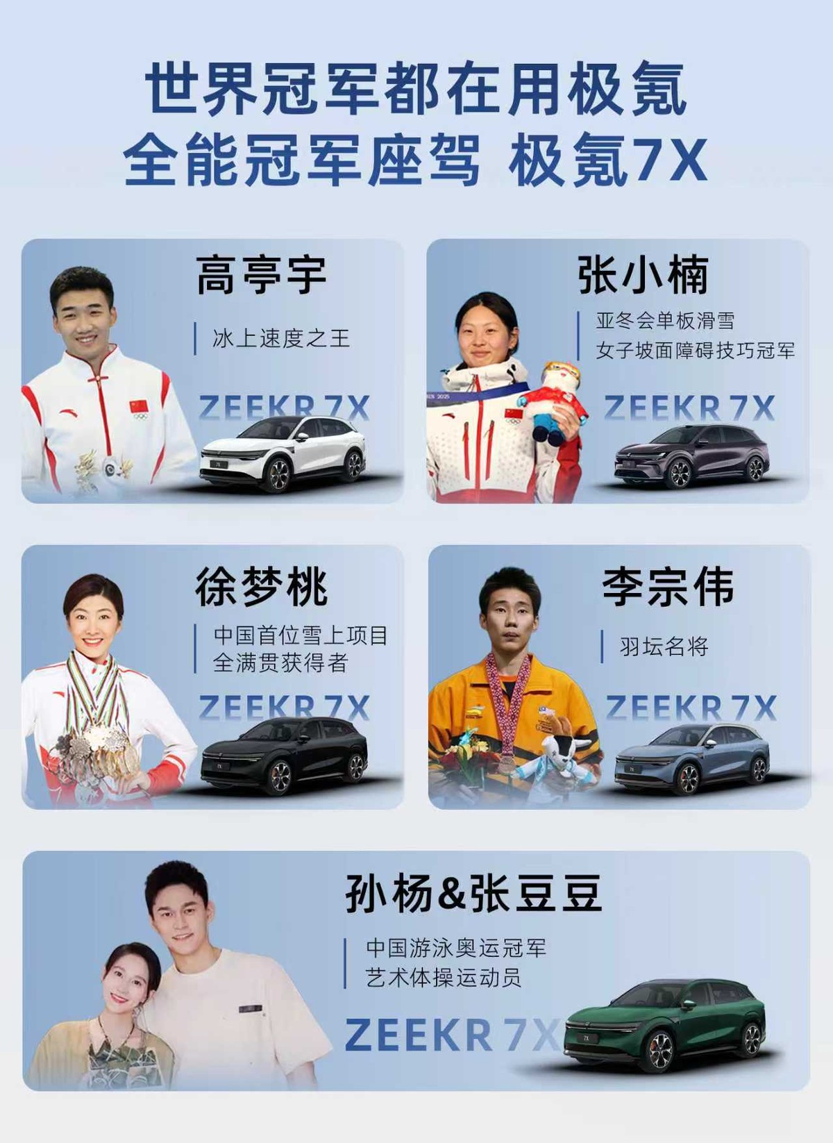 李宗伟的加入,让极氪7X的“冠军车主”阵容再次壮大。回顾这份名单,仿佛在翻阅一部中国体坛荣誉史:自由式滑雪空中技巧奥运冠军徐梦桃、速度滑冰奥运冠军高亭宇、游泳奥运冠军孙杨与艺术体操冠军张豆豆夫妇、亚冬会单板滑雪冠军张小楠等,都已成为极氪7X的车主。