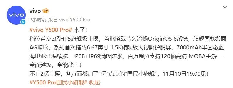 今日,vivo Y500 Pro 官宣将于11月10日19:00发布,slogan 为“国民小旗舰”,在该价位首发搭载 2 亿像素的三星 HP5 旗舰级主摄。
