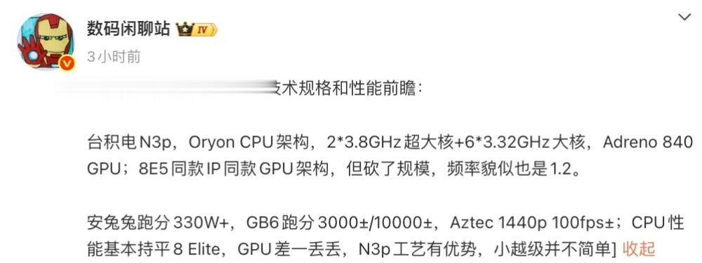 参考同一位博主的爆料信息,第五代骁龙 8 基于 3nm 制程工艺,定制 Qualcomm Oryon CPU,拥有2个 3.8GHz 超大核、6个3.32GHz 大核,配备Adreno 840 GPU。基于此,第五代骁龙 8 的安兔兔跑分超过330万,Geekbench 6单核3000分左右,多核10000分左右。