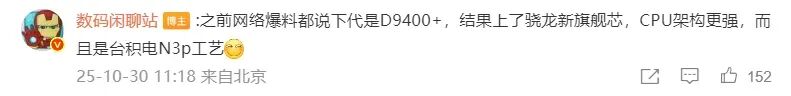 后续他还在评论区补充道,之前网络爆料都称这台机器会搭载天玑 9400 + 芯片,结果上了骁龙新旗舰芯,CPU 架构更强,而且是台积电 N3p 工艺。