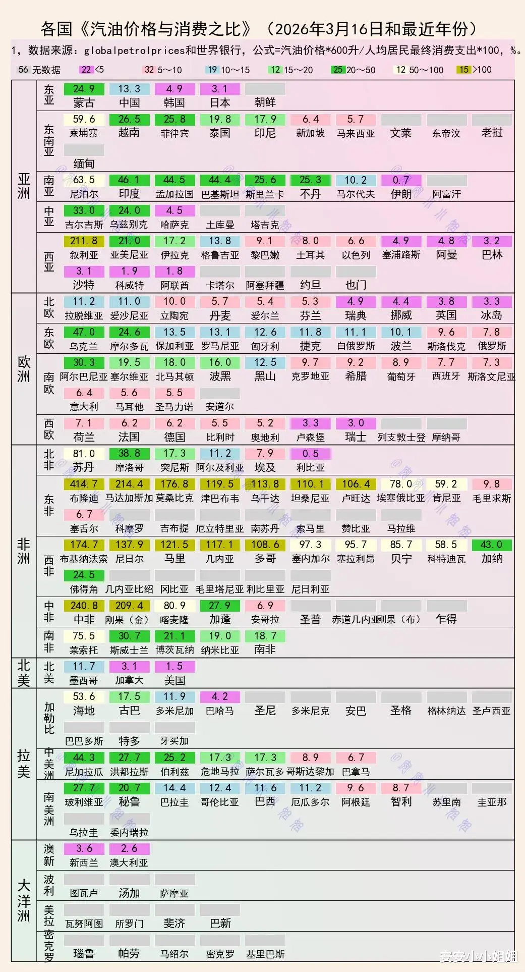 本次统计覆盖全球近两百个国家与地区,以 2026 年 3 月 16 日的实时油价为基准,结合最近年份人均居民最终消费支出,统一按照每人每年消耗 600 升汽油的标准测算,得出汽油开支占个人消费总额的比例。