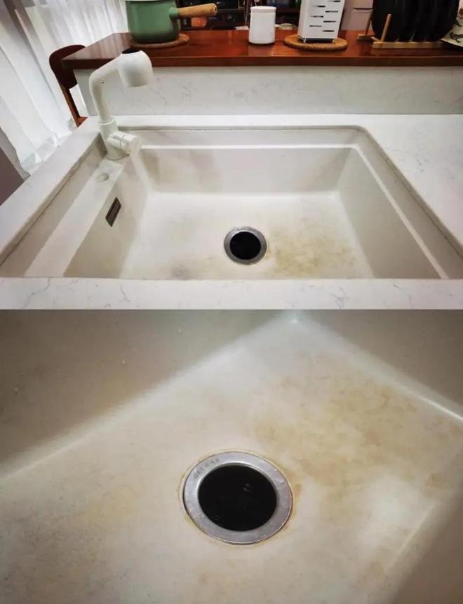 但在使用过几次后就会发现,白色的石英石水槽在经过多次的洗碗、锅后,就会出现黑色痕迹。